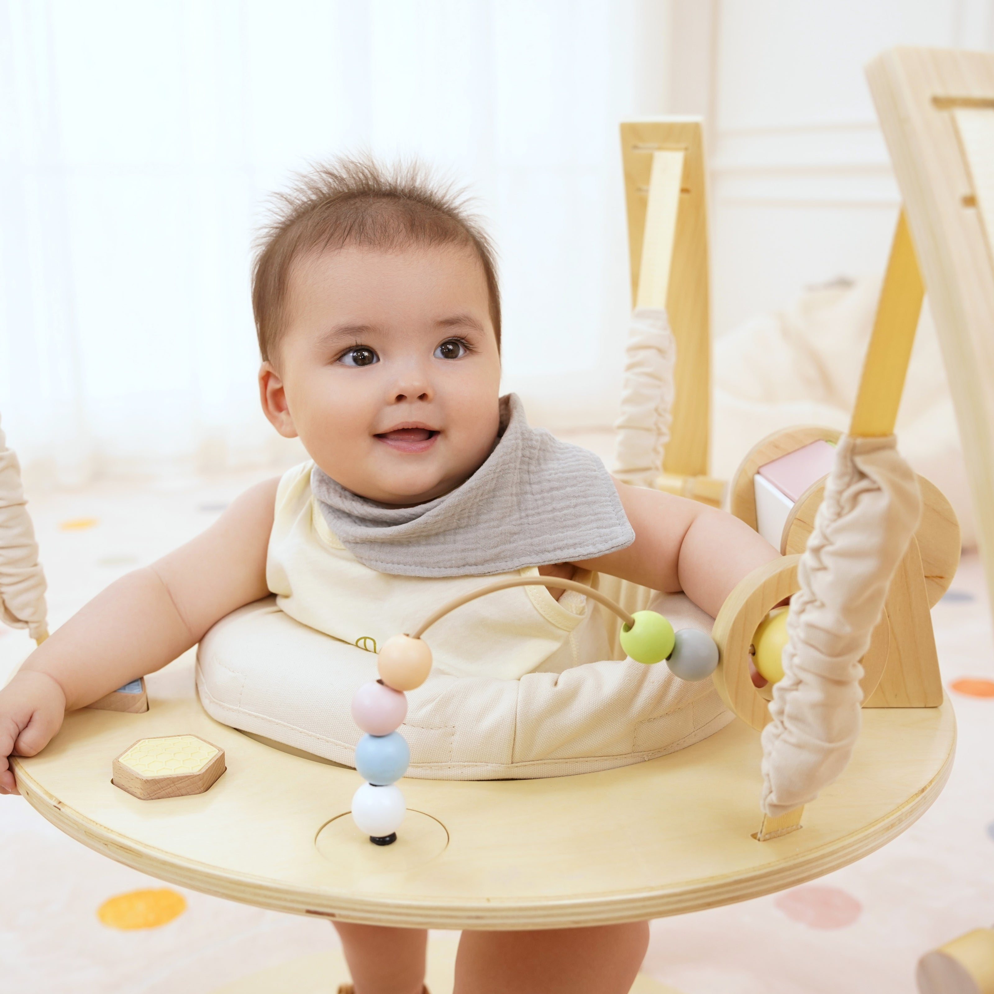 The IVY’s spring-suspended seat gently bounces and spins, giving babies the freedom to move, reach, and explore. With built-in tactile elements like bead sliders, spinners, and rotating drums, every detail is made to engage active little hands.
