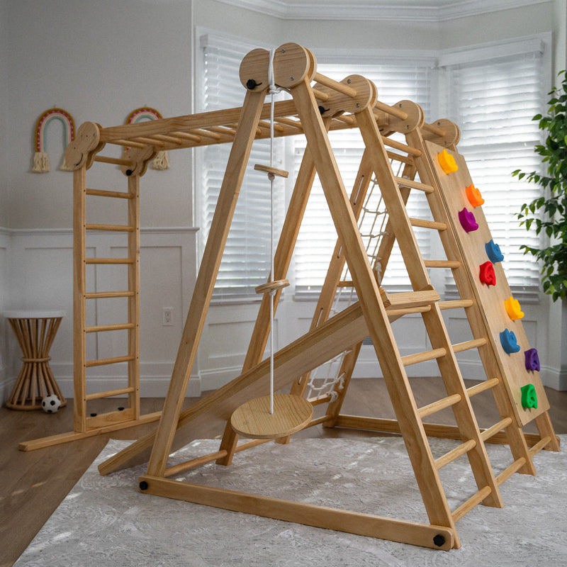 Avenlur’s Chestnut 8-in-1 Indoor Jungle Gym doubles as a play gym for toddlers and a growth-focused activity center for older children, adapting to their developmental needs as they age.