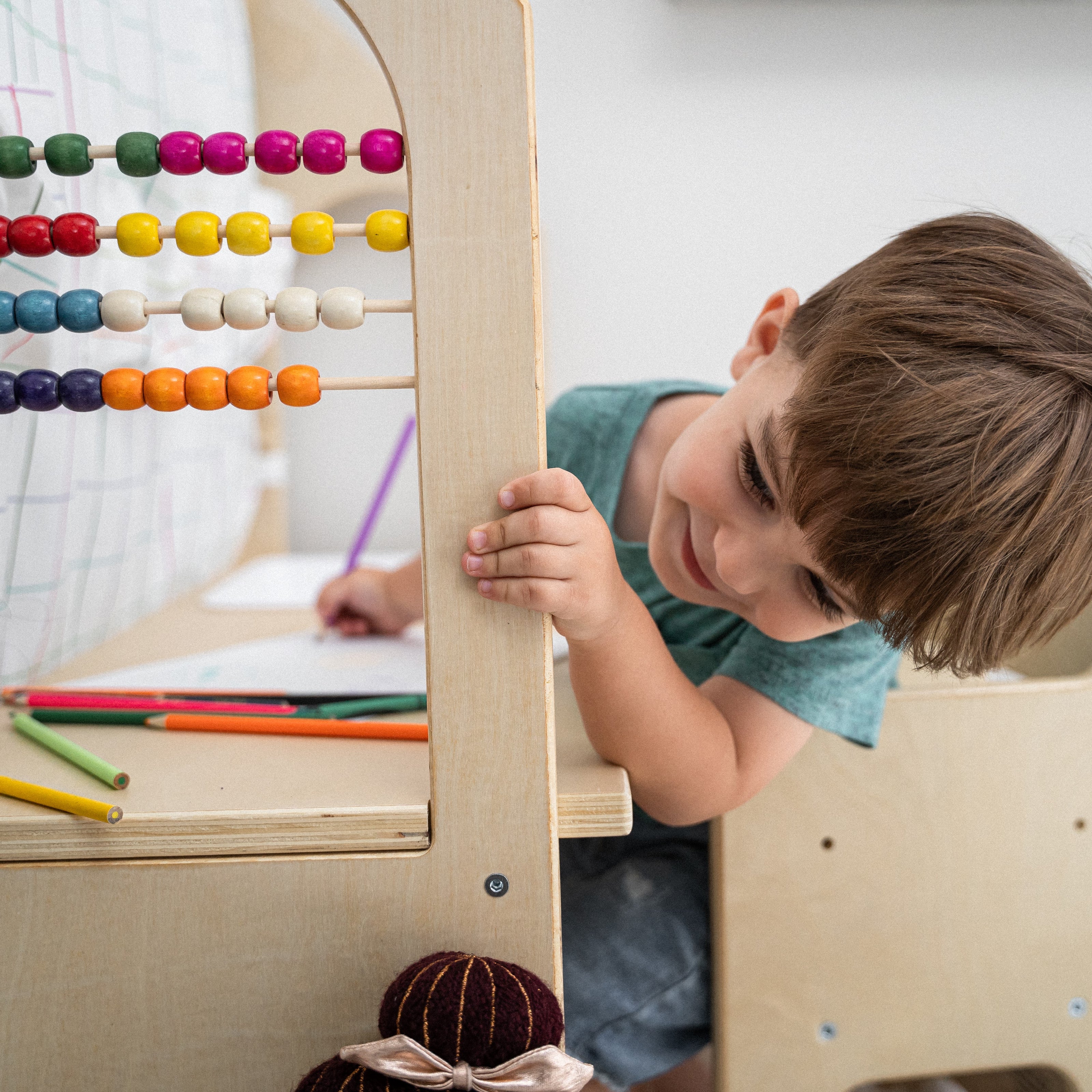 - KEEPS KIDS ENTERTAINED: Avenlur's beautiful indoor playhouse is the best way to keep kids entertained at home | Its spacious interior space is large enough for several kids to play at the same time. Stunning Flair Avenlur Montessori Waldorf Style Modern Wood Playhouse Play Tent with Desk, Table, Chair, Chalkboard, Game and Floor Cushion for Toddlers and Kids Ages 1-6yrs (Large) Adjustable Height Desk & Chair - Adjust desk or chair between two levels for different ages