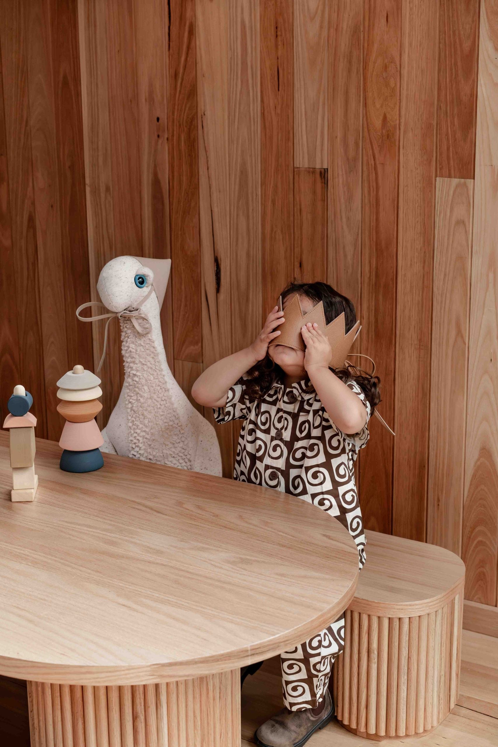 The smooth, oval tabletop offers ample room for activities, crafts, and learning, while the signature fluted cylindrical legs provide a modern sculptural elegance. Finished in a child-safe matte coating, every element is as durable as it is beautiful—perfect for both residential and classroom environments.