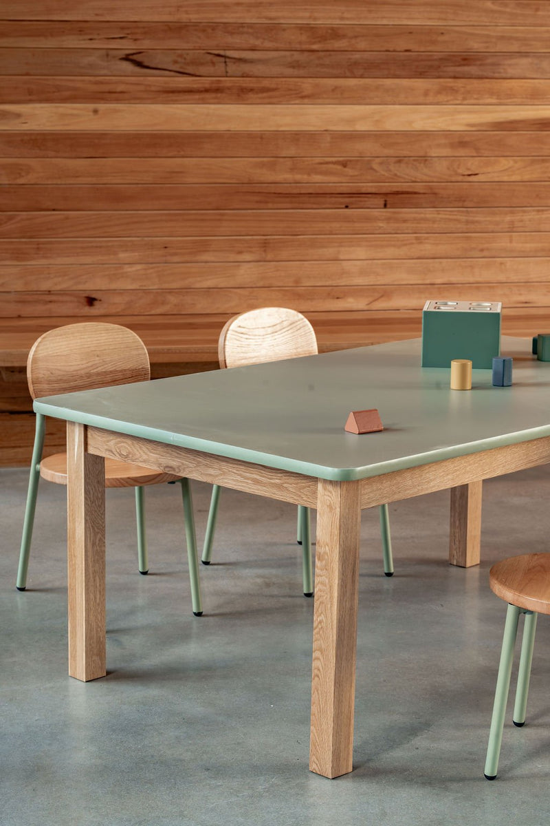 Bring a clean, modern look to your childcare centre or classroom with our Matt Sage Rectangle Table. The durable matt sage melamine surface paired with aΒ solid European Oak frame offers everyday functionality with a refined, modern feel.