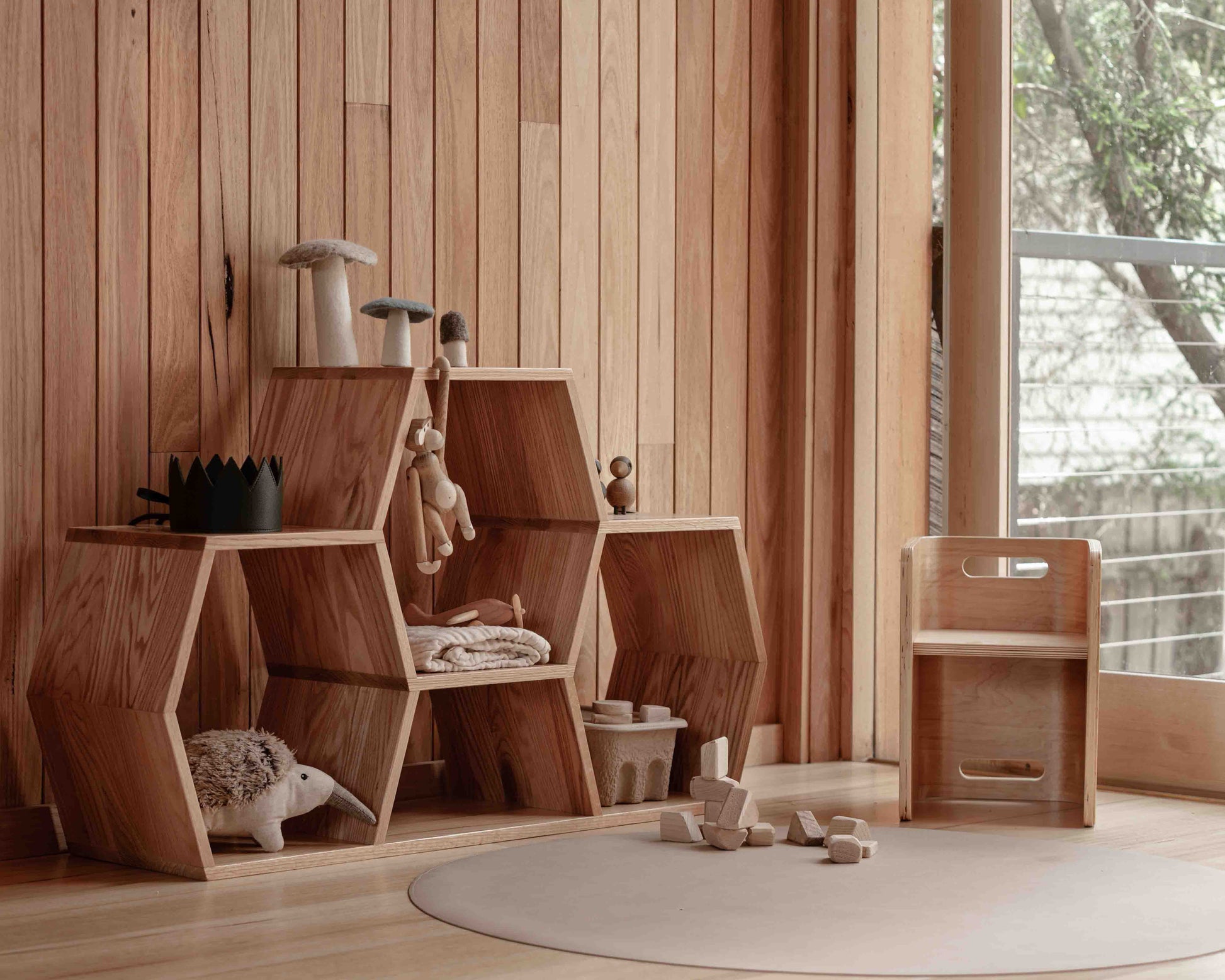 The Medium Honeycomb Shelf is a versatile, modular storage unit crafted from durable European oak. Its geometric honeycomb form brings functional organization and a warm, contemporary aesthetic to playrooms, nurseries, and classrooms. Use it on its own or combine multiple units to create a beehive-style display that keeps materials visible and within easy reach for little learners.