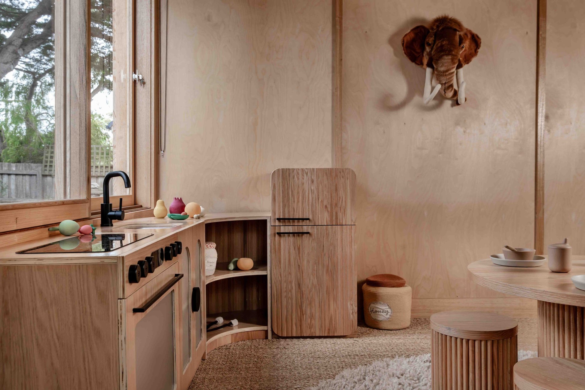 Rounded edges, visible wood grain, and fluted panels make this fridge safe and beautiful for any Montessori or design-conscious environment.